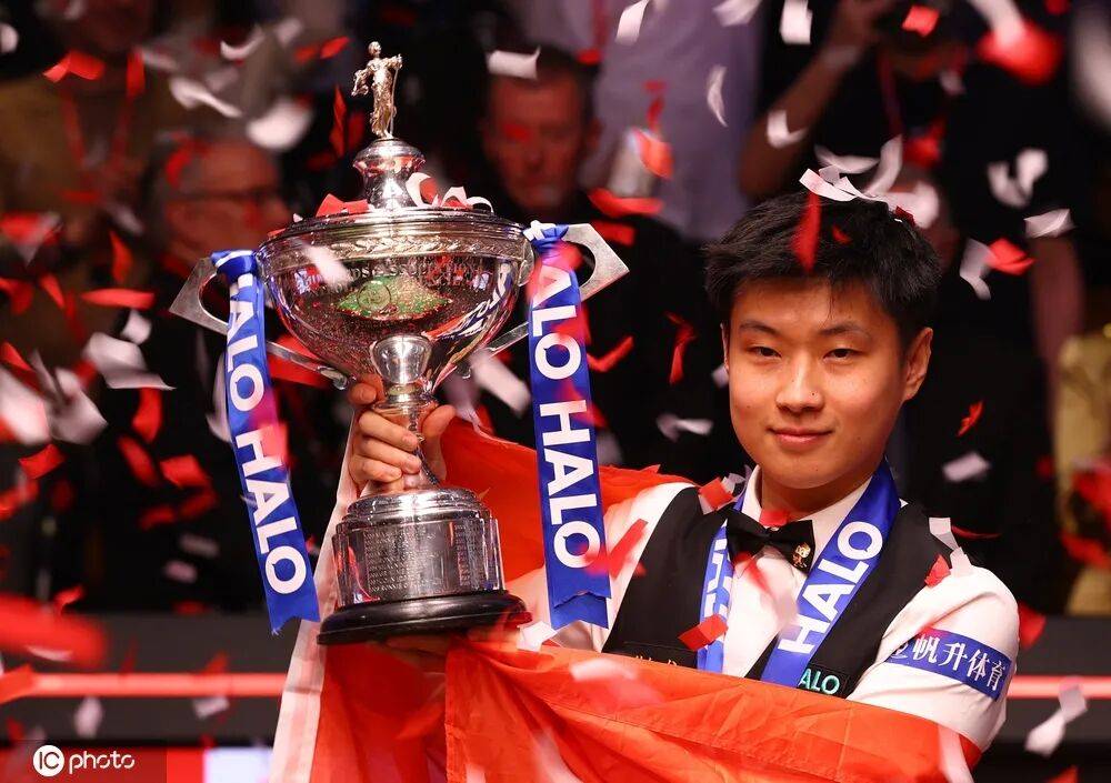 当地时间2025年5月5日,英国谢菲尔德,2025斯诺克世锦赛决赛,赵心童VS马克-威廉姆斯。中国选手赵心童在克鲁斯堡捧起世锦赛冠军奖杯。