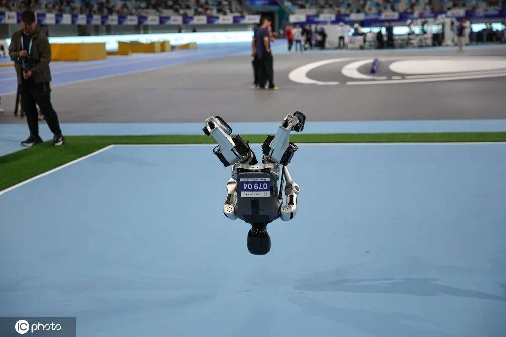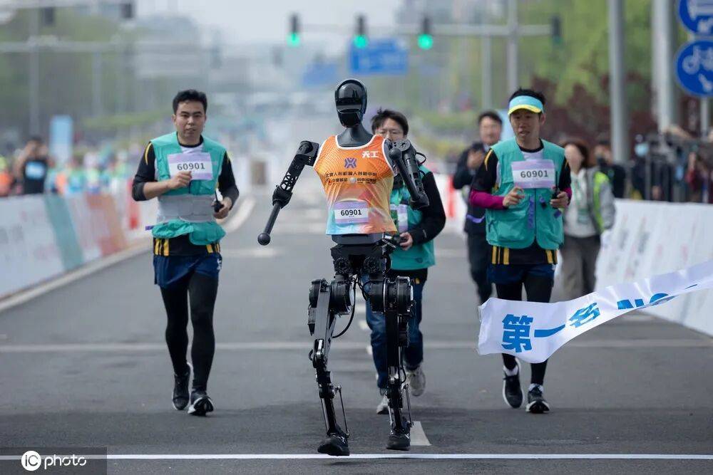 2025年4月19日,全球首个人形机器人半程马拉松在北京亦庄正式开跑。图为天工机器人冲线。