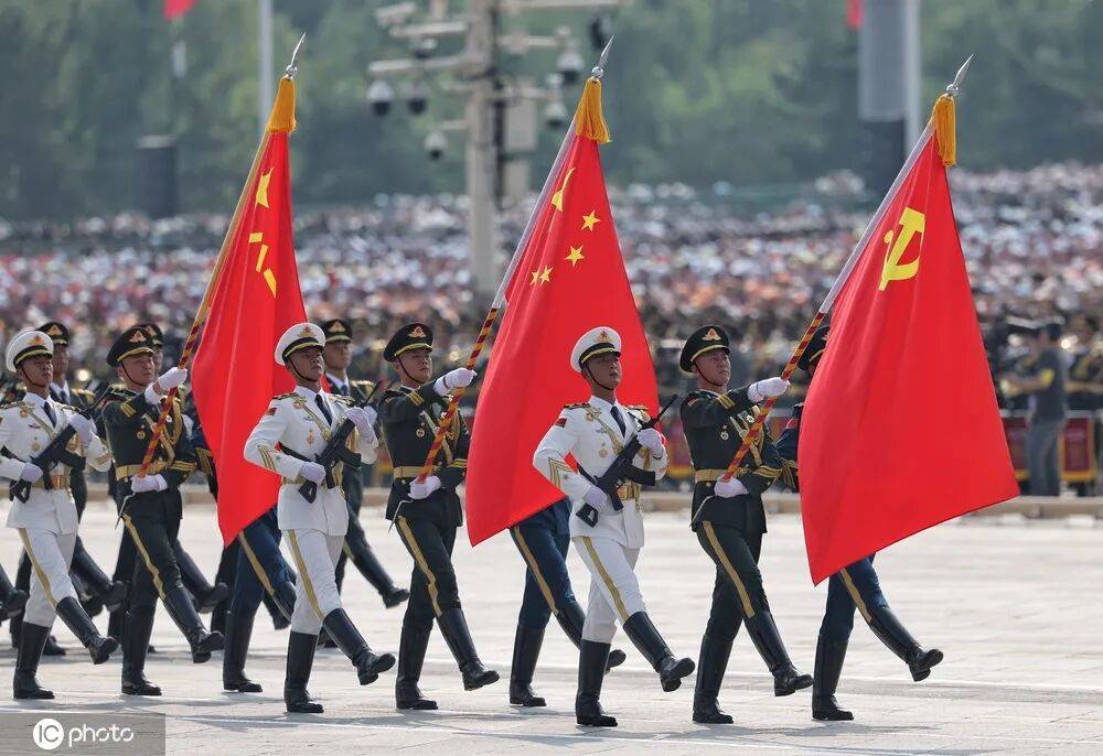 2025年9月3日,北京,中国人民仪仗方队阔步走来,旗手高擎党旗、国旗、军旗。