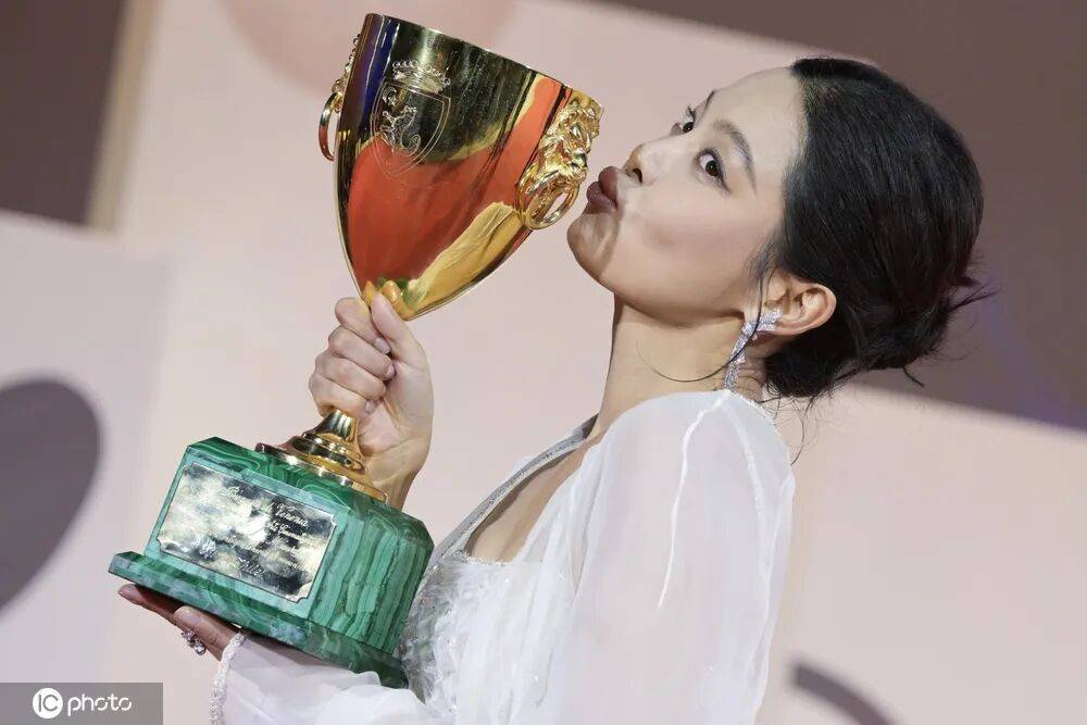 当地时间2025年9月6日,意大利威尼斯,第82届威尼斯国际电影节闭幕颁奖礼,中国演员辛芷蕾凭借电影《日掛中天》获得最佳女演员奖。图片来源:epa/IC photo