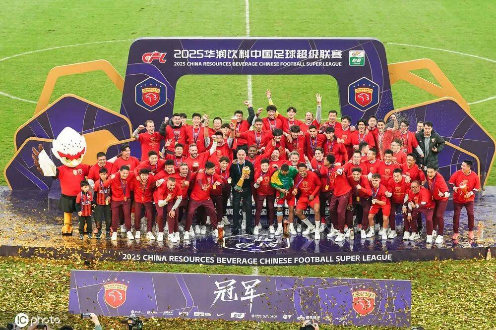 2025年11月23日,辽宁大连,2025赛季中超联赛冠军颁奖仪式,上海海港获得2025赛季中超冠军。穆斯卡特率上海海港全队捧起中超冠军奖杯。