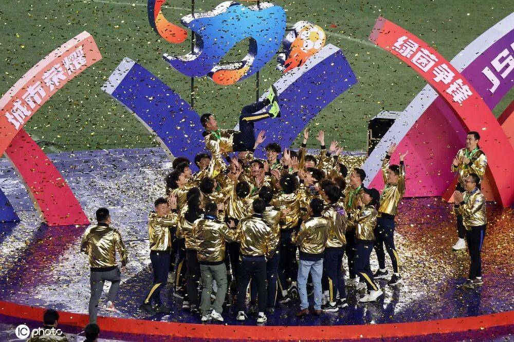 2025年11月1日,江苏南京,2025年江苏省足球城市联赛决赛,南通0-0(点球3-4)泰州。泰州队在南京奥体中心夺得2025年江苏省足球城市联赛冠军后,在领奖台上庆祝。