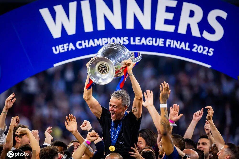 当地时间2025年5月31日,德国慕尼黑,24/25赛季欧冠决赛,巴黎圣日耳曼VS国际米兰。巴黎圣日耳曼主教练恩里克与巴黎圣日耳曼全队一同捧起欧冠冠军奖杯。