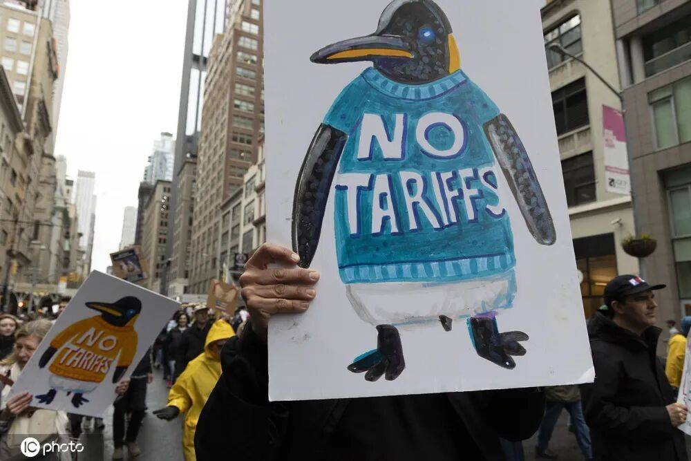 当地时间2025年4月5日,美国纽约,抗议者手举画有企鹅形象的标语牌,反对特朗普政府征收关税。据悉,美国总统特朗普宣布对贸易伙伴开征“对等关税”,就连偏远的无人岛——那些只有海豹和企鹅栖息的荒凉之地都没有放过。在社交媒体上,不少网友以恶搞形式调侃美国对“企鹅征税”的荒诞举动。