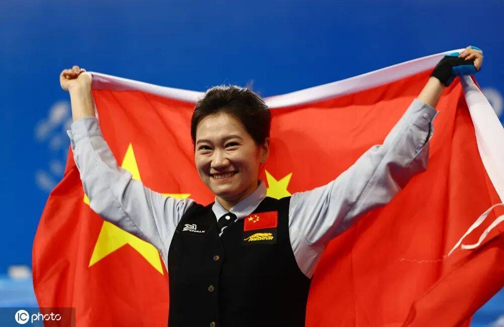 2025年8月14日,四川成都,2025成都世运会女子花式台球决赛,中国选手韩雨获胜夺冠,身披国旗庆祝。