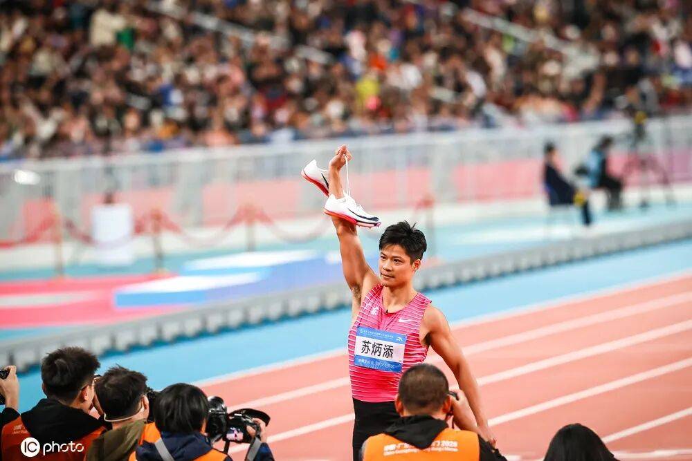 2025年11月20日,在全运会田径赛场的男子4×100米接力决赛上,“亚洲第一飞人”苏炳添站上跑道,跑出自己职业生涯的最后一枪。 广东队分在第二道,第一棒,就是36岁的苏炳添——这是他的第五次全运会,也是他为自己挑选好的谢幕舞台。最终,电子计时牌最终定格在38秒71——广东队列第四。前三名依次是湖北队38秒60、江西队38秒64、江苏队38秒68。